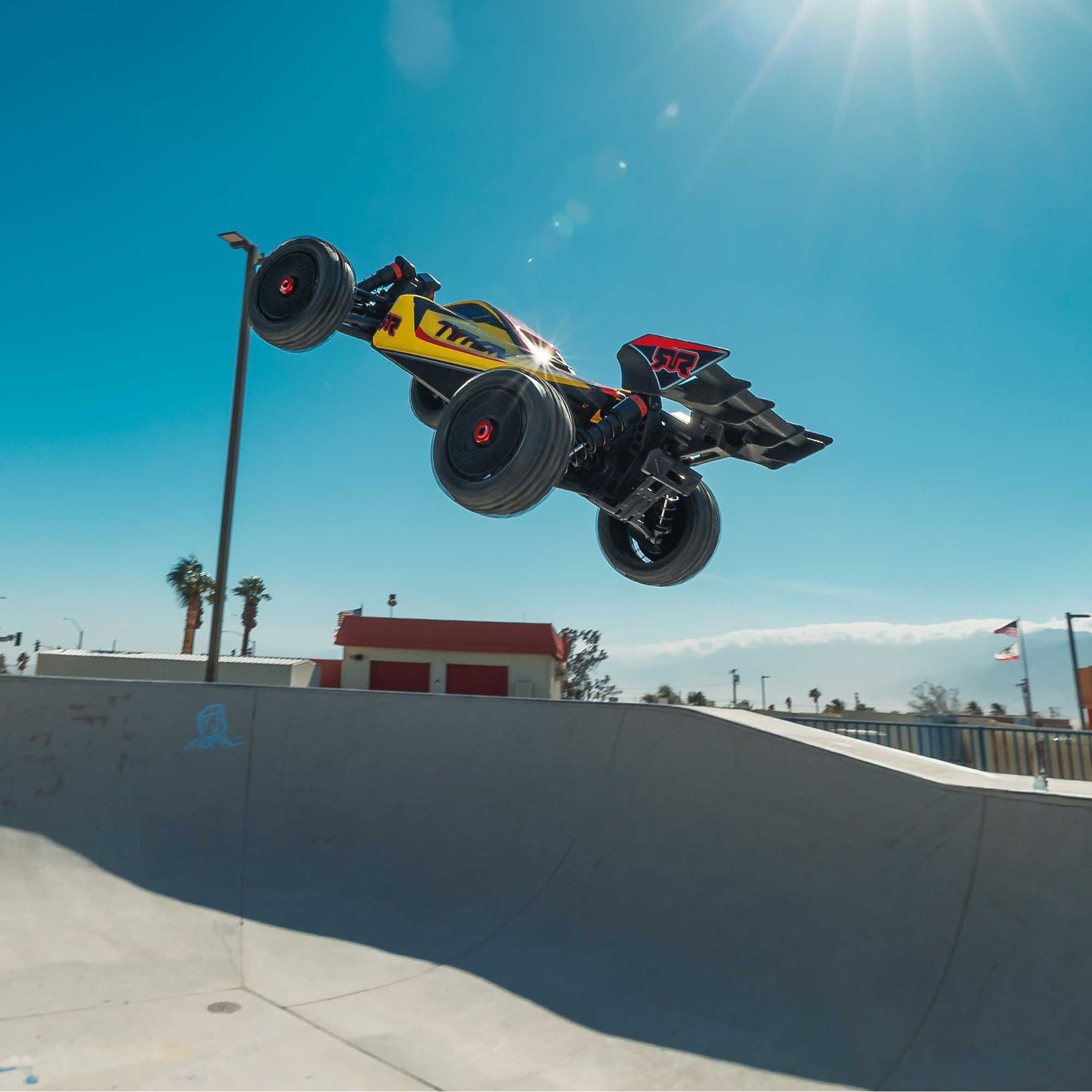 So just add your own battery and charger. Then, take your ARRMA TYPHON MEGA 665 4x4 to your favorite dirt, gravel, or short grass bashing grounds. Set up some ramps or dirt mounds. Grab the transmitter, punch the throttle - and get set to speed and leap in a big way!