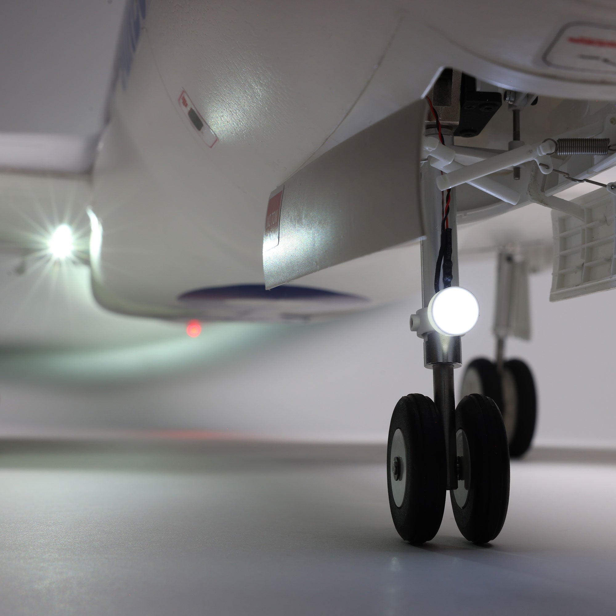 The factory-installed electric retracts are equipped with durable metal components including shock-absorbing struts that make it possible to fly from a variety of surfaces including paved and fabric runways, packed dirt and some grass fields. Wide-spaced main gear plus a steerable nose wheel, all with dual wheels, offers excellent ground handling.