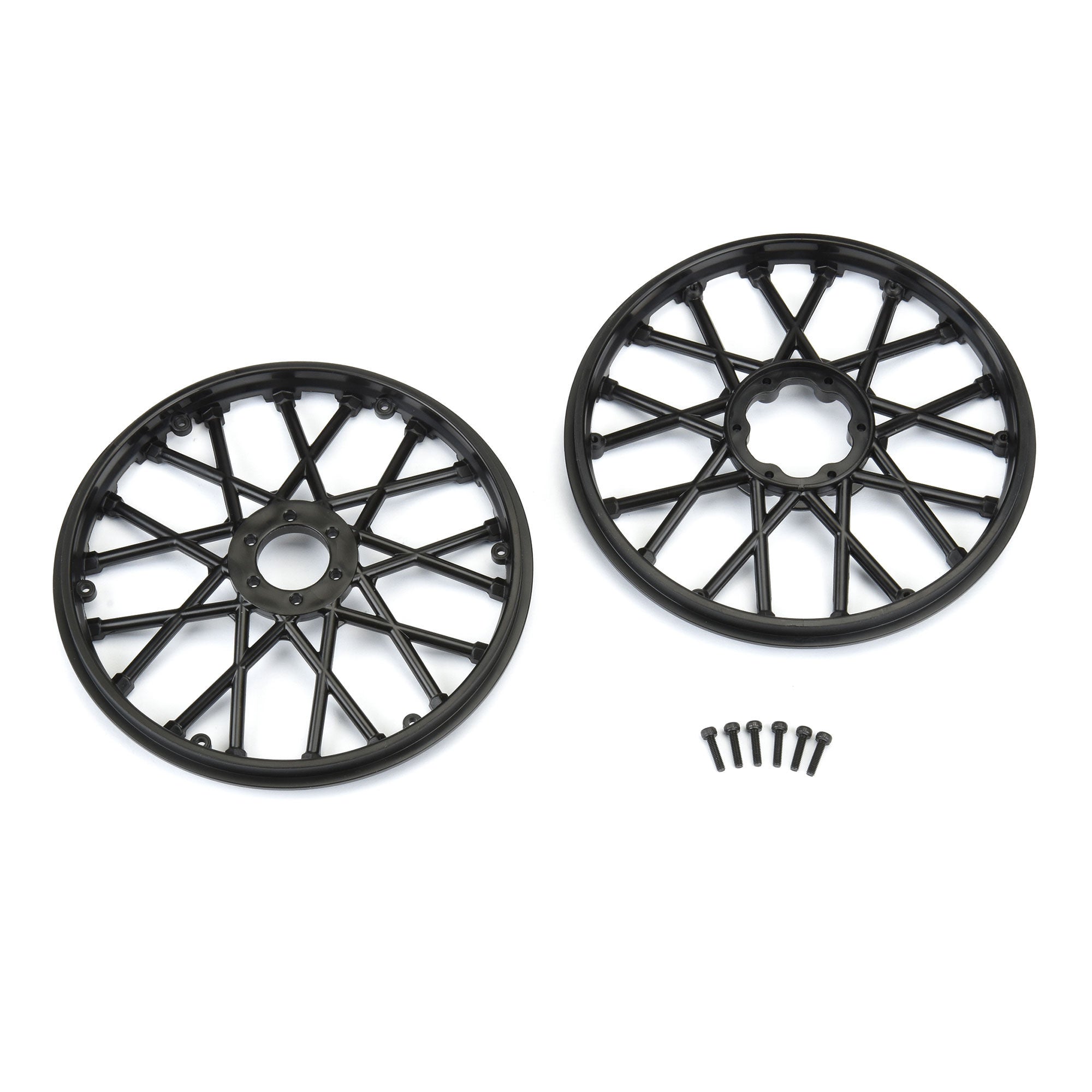 The Bullyspoke wheel features thicker spokes than stock wheels to prevent bending on hard impacts. It utilizes Pro-Line's V2 Bead style, which has benefits in both ease of use and aesthetics. The wide, flat 1/8 buggy-style glue mounting bead makes tire gluing a cinch. The beads overall have been brought in towards the center of the wheel, which creates a much more scale-looking tire profile that matches your real dirt bike. Pair this with Pro-Line MX33 tires (PRO1022901) for the ultimate upgrade in style and performance! These wheels are molded from high-quality black nylon right here in the USA.