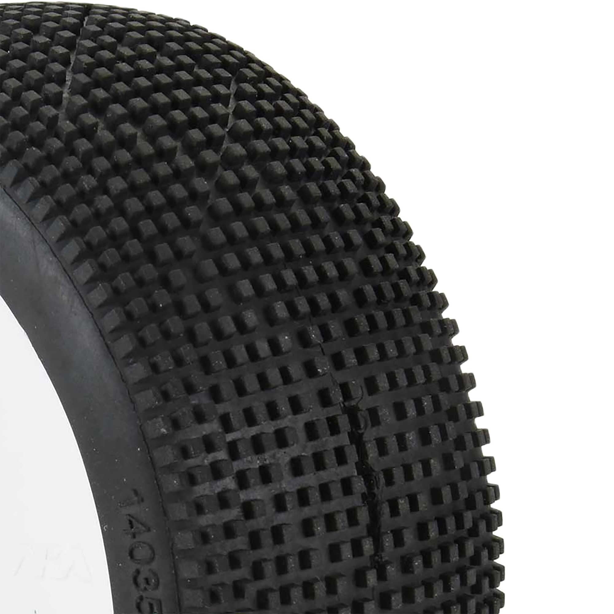 Introducing the AKA Diamante 1/8 Buggy race tire! AKA's next generation tire has been engineered for hard-packed, dusty, blown-out track conditions. Diamante development started by looking at the key factors to designing a winning tire for today's racetracks: bump handling, longevity, and grip. To combat the bumps and ruts, AKA used their latest carcass design found on the race-winning Component 2AB. This carcass design has been optimized for bumpy track conditions. Additionally, micro-pins at the outer edges reduce edginess in the bumps. The Diamante is AKA's most dense tread pattern tire to date, ensuring maximum runtime for bashers and racers alike. Two key design factors contribute to overall grip. The rectangular lugs have been positioned with the short side facing the direction of the tire rotation. Thus, giving the lugs maximum support under load for increased forward bite. A diamond-like pattern between the lugs gives the Diamante an unmatched grip in slightly dusty conditions which usually occurs towards the end of a long main event.