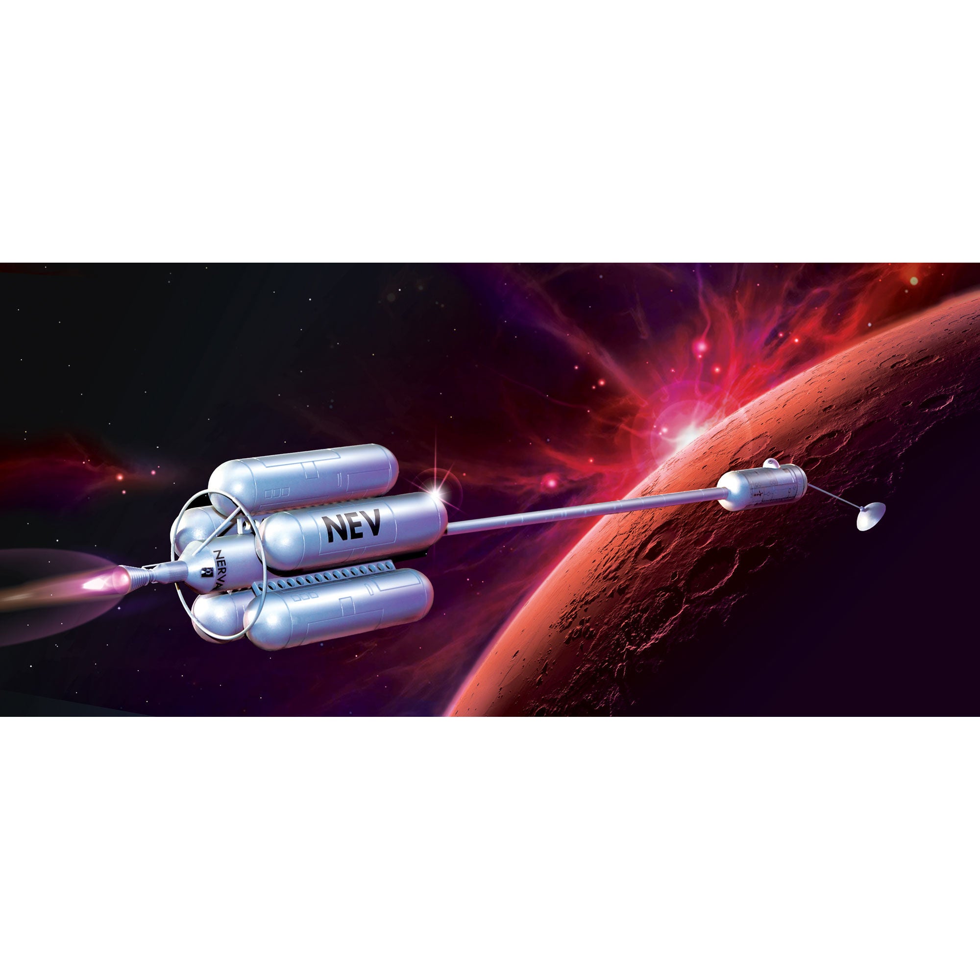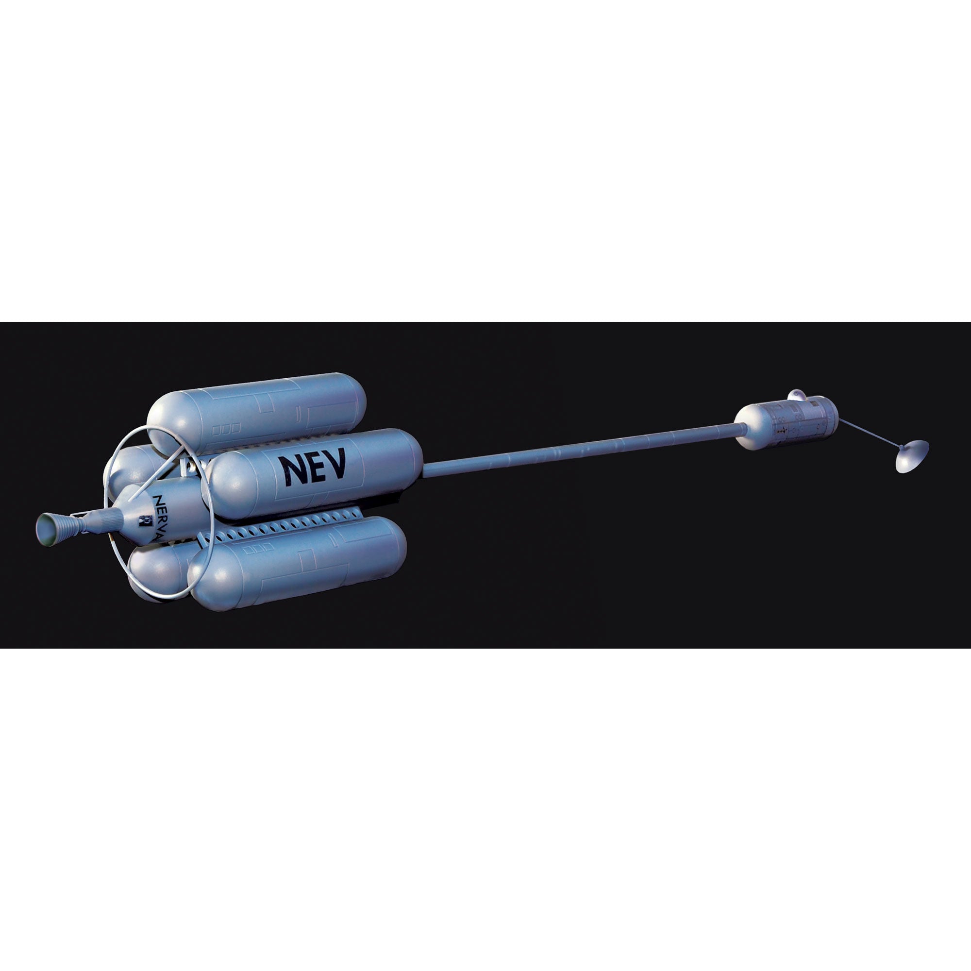 The Nuclear Exploratory Vehicle was designed by Krafft Ehricke (1917-1984) in the mid-1950s. A visionary engineer and protégé of Walter Thiel at Peenemunde (1942 V-2 team), he had early concepts for nuclear and Lox/LH2 engines and advanced spacecraft designs. The NEV spacecraft was proposed to be assembled in space at a low orbit and would be powered by a NERVA (Nuclear Engine for Rocket Vehicle Application) mod-2 engine. Ehricke imagined the spaceship to have a habitat for up to four astronauts in the front of the spacecraft separated by a long neck to reduce exposure to radiation by the nuclear engine.