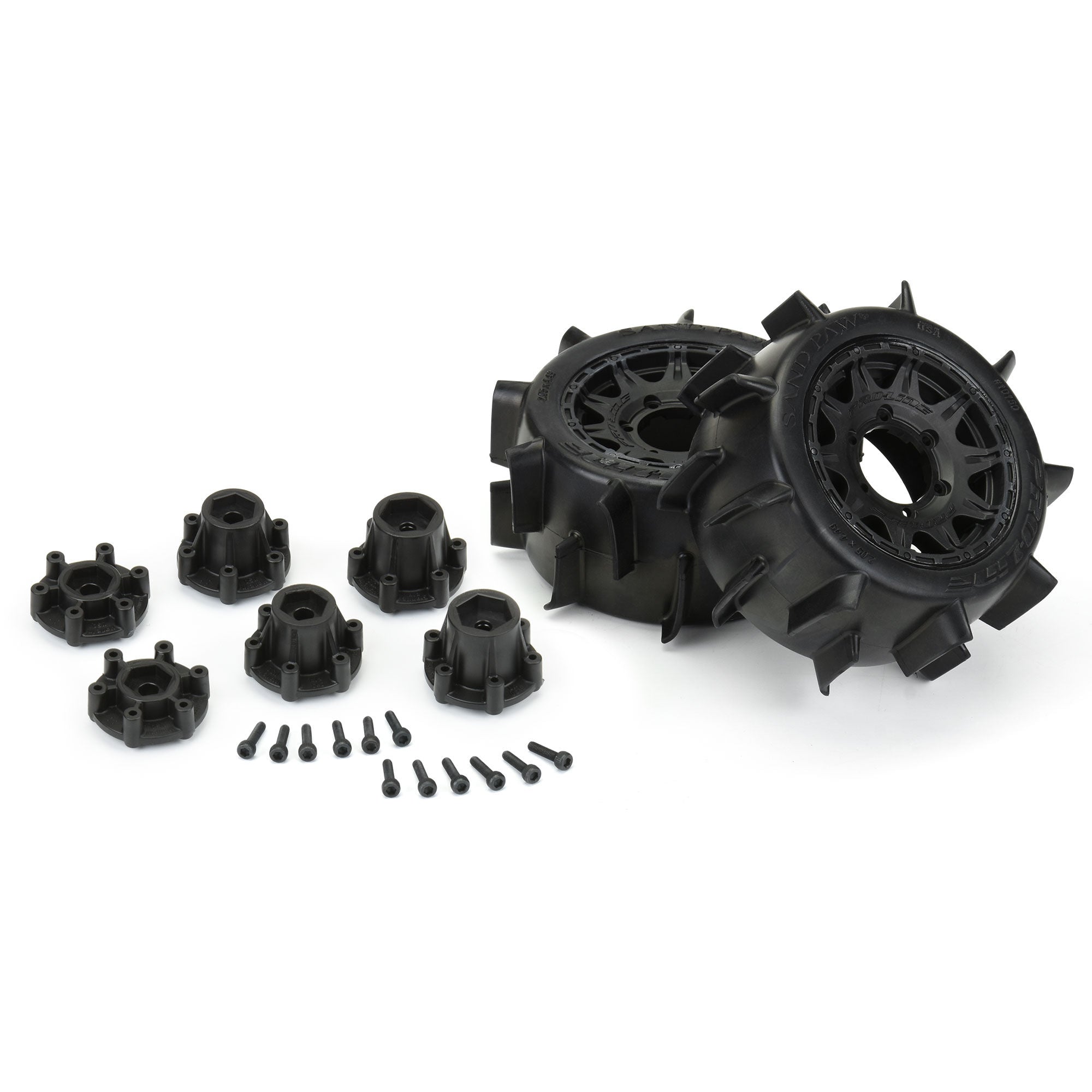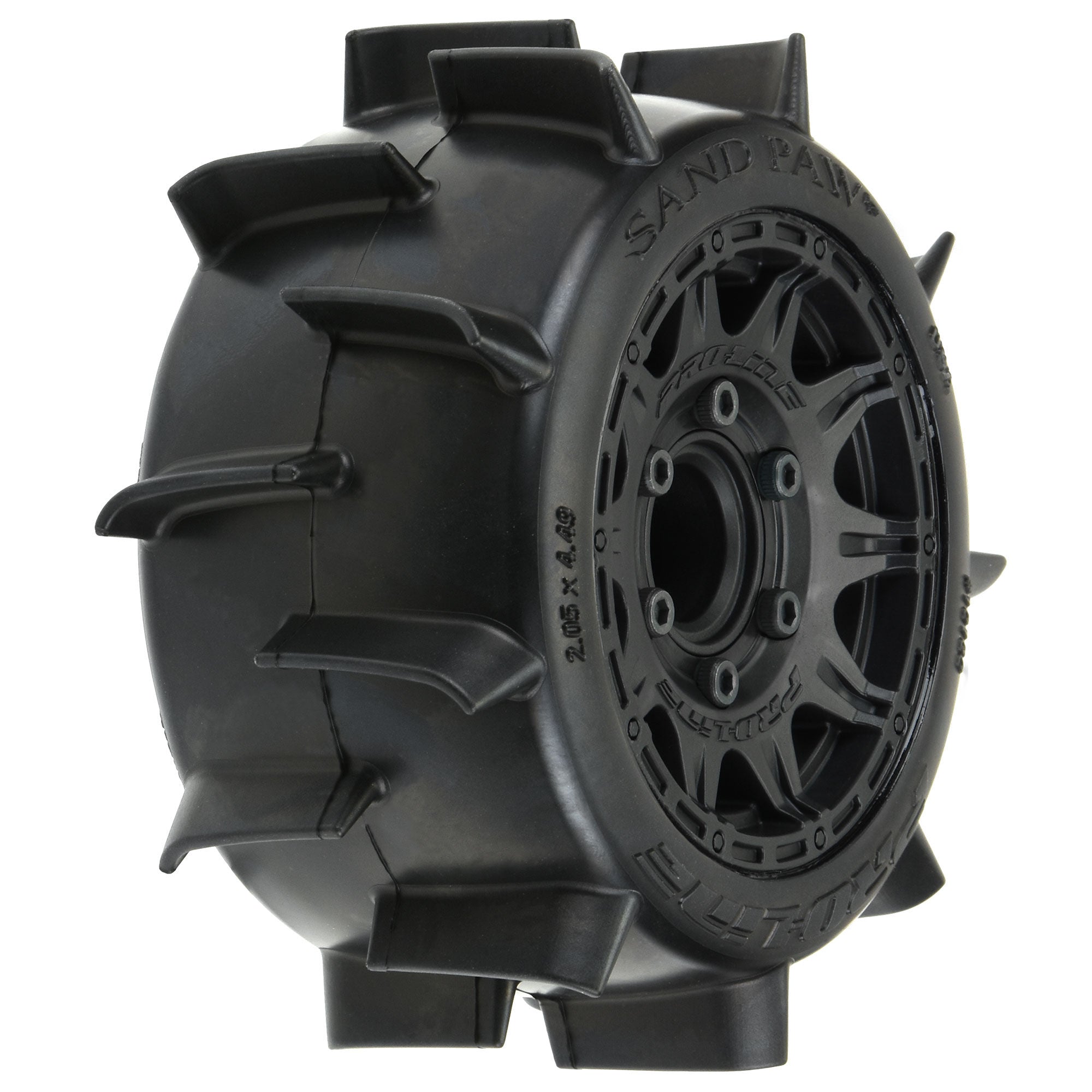 PRO1016010 | Sand Paw LP 2.8" Sand Tires Mounted on Raid Black 6x30 Removable (12mm & 14mm) Hex Wheels (2) for Vorteksā„¢, RustlerĀ® 2WD & 4WD Front and Rear