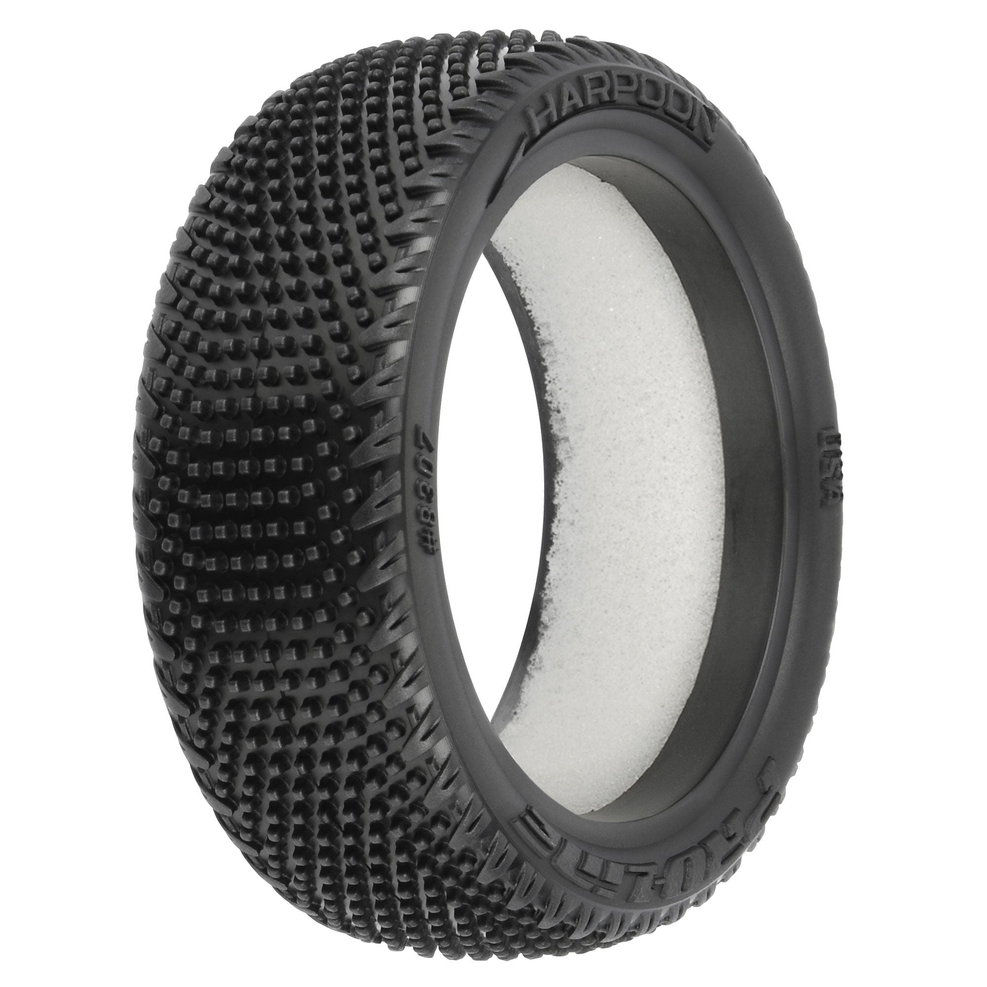 Introducing the Harpoon, Pro-Line's latest and greatest solution for high-grip 1/10 Carpet Buggy Racing. The Harpoon features a unique, modern pin design with a round base for more support and longer wear. The directional pin layout gives the racer options to tune forward and site bite characteristics depending on track conditions. A narrow, lower profile carcass improves agility and reduces sidewall fold-over. The outside harpoon-shaped lugs increase high-speed cornering stability in high grip conditions, reducing the need for sidewall CA gluing.