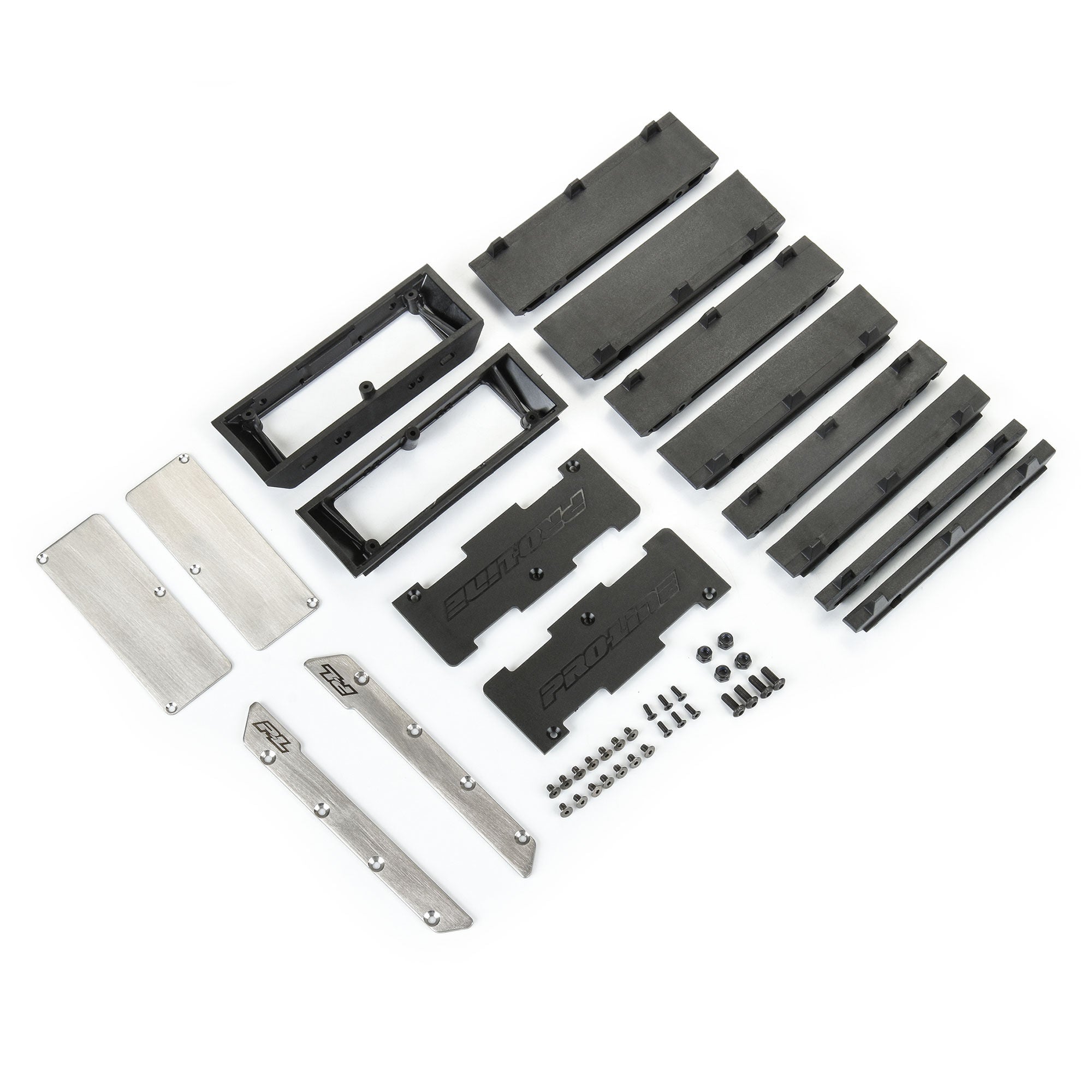 Protect your door panels with Pro-Line's Universal Body Capture Rock Sliders. These universal Rock Sliders have adjustable widths to fit most bodies, and various mounting holes to fit a wide range of chassis. The high clearance design reduces the number of interactions with rocks, while the stainless steel inserts and rails make for a smoother sliding action when they are unavoidable.