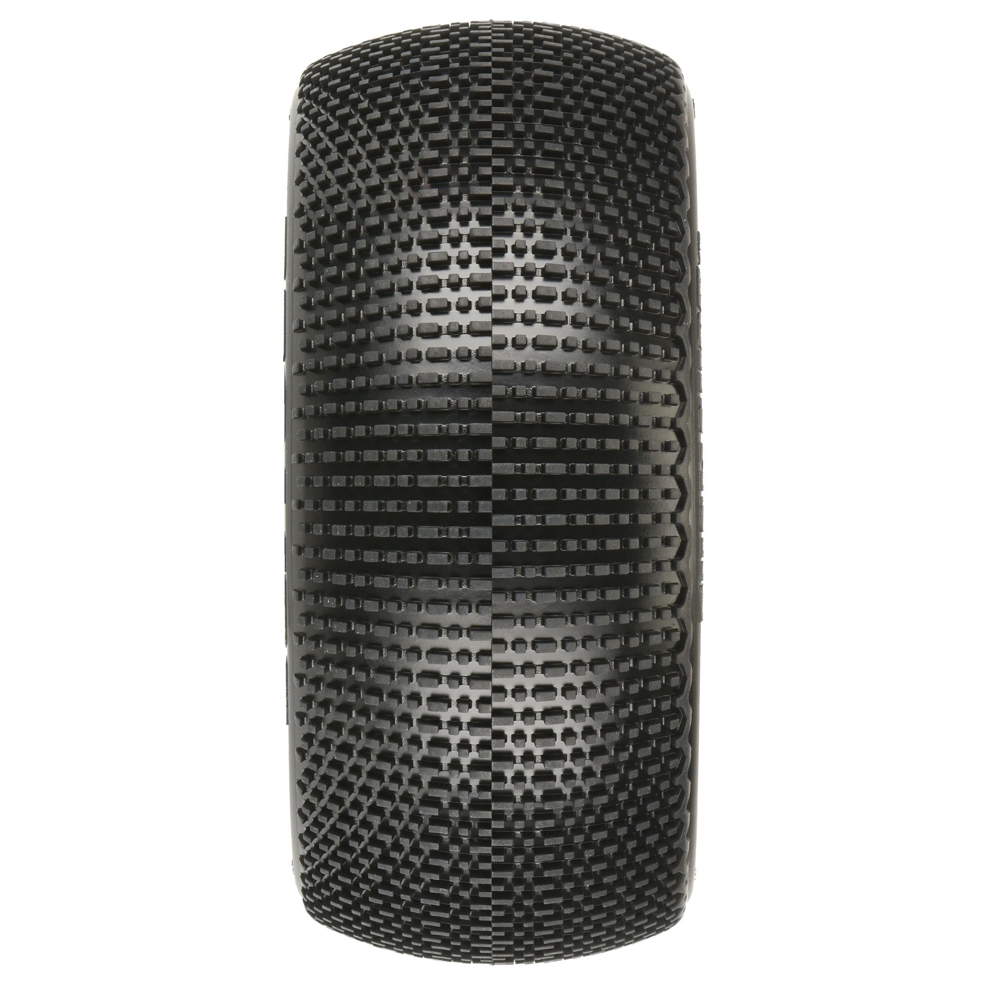 This is a pair of Buck Shot 1/8 Truck Tires. The Buck Shot debuted at the 2017 ROAR National Championships and is already a Winner! The Buck Shot has pins that are very close in size to the amazing Hole Shot 2.0 but the Buck Shot pins are stacked closer together side to side, which provides significantly longer-lasting performance. Unique to the Buck Shot are the alternating elongated bars that provide incredible forward grip! Similar to the extremely popular SwitchBlade tire, the Buck Shot is a directional tire with different tread on the outside compared to the inside, allowing you to mount the tires in the direction that suits your current track conditions. One side of the tire has standard pins, which is ideal for loose or low traction conditions where you want the tire to add side grip and improve steering. When you mount the tire the other direction, the connected side tread (Blade) reduces side traction in high-bite or edgy conditions. Racers who have tried the Buck Shot are saying that it is their new favorite tire! Be the first at your track to win with Pro-Line's Buck Shot!