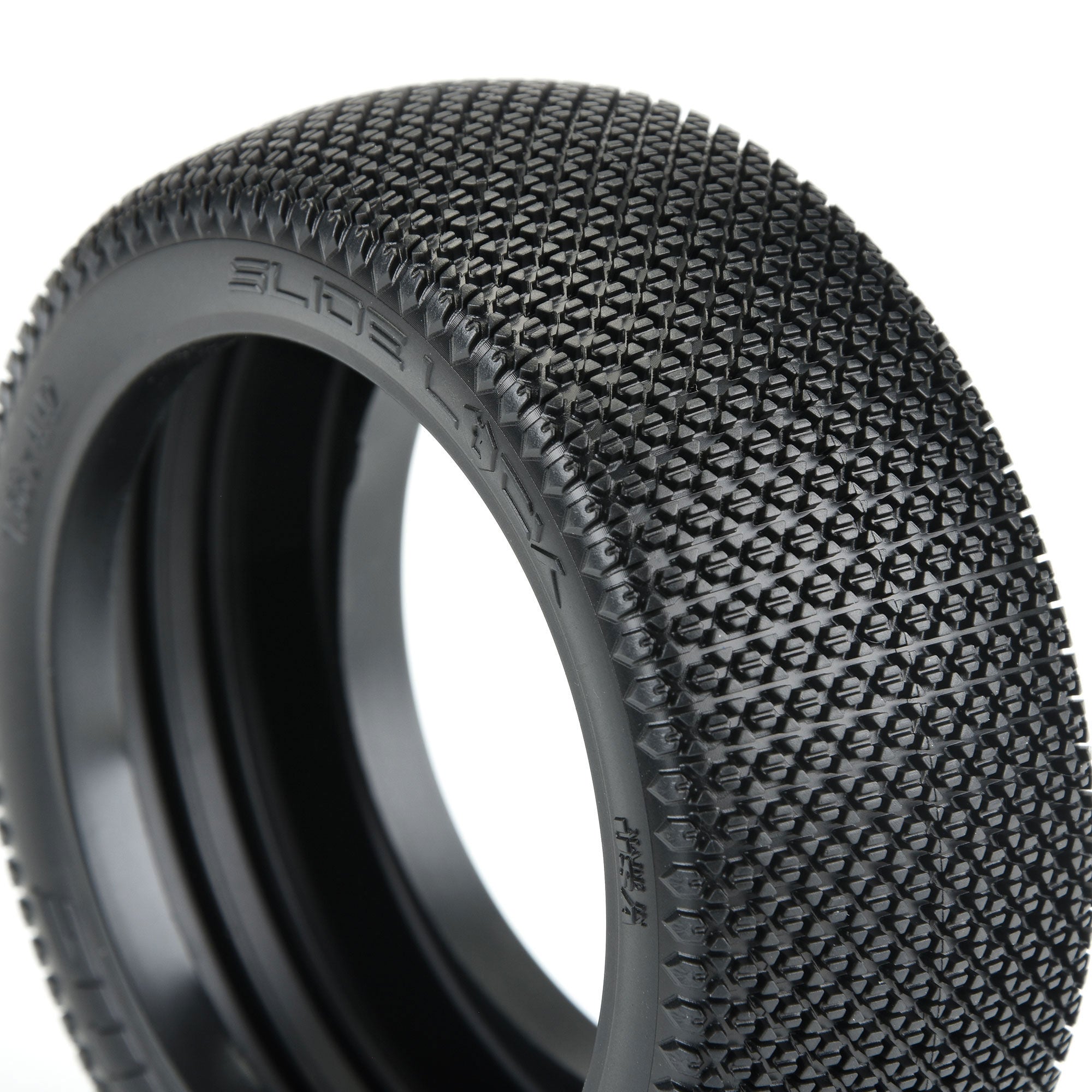 This is a pair of Slide Lock 1/8 Buggy Tires. The Slide Lock is a unique tire design from Pro-Line that is made specifically for smooth, low grip tracks. The Slide Lock features a pattern of small, tightly packed hexagon and triangle shaped pins so you can lay down as much rubber as possible. The tread on the Slide Lock is laid out wider across the tire carcass for a flatter profile overall compared to other Pro-Line 1/8 Race Tires. Each hexagon pin has a deep sipe down the middle of the tread for added flex and grip on even the slickest of surfaces. The built-in tread flex means you can run harder compounds for longer wear and still have good traction when you need it. The large and stiff side pins reach far down the sidewall to reduce edginess as much as possible. Be the first at your track to win with Pro-Line's Slide Lock tire. Get yours today!