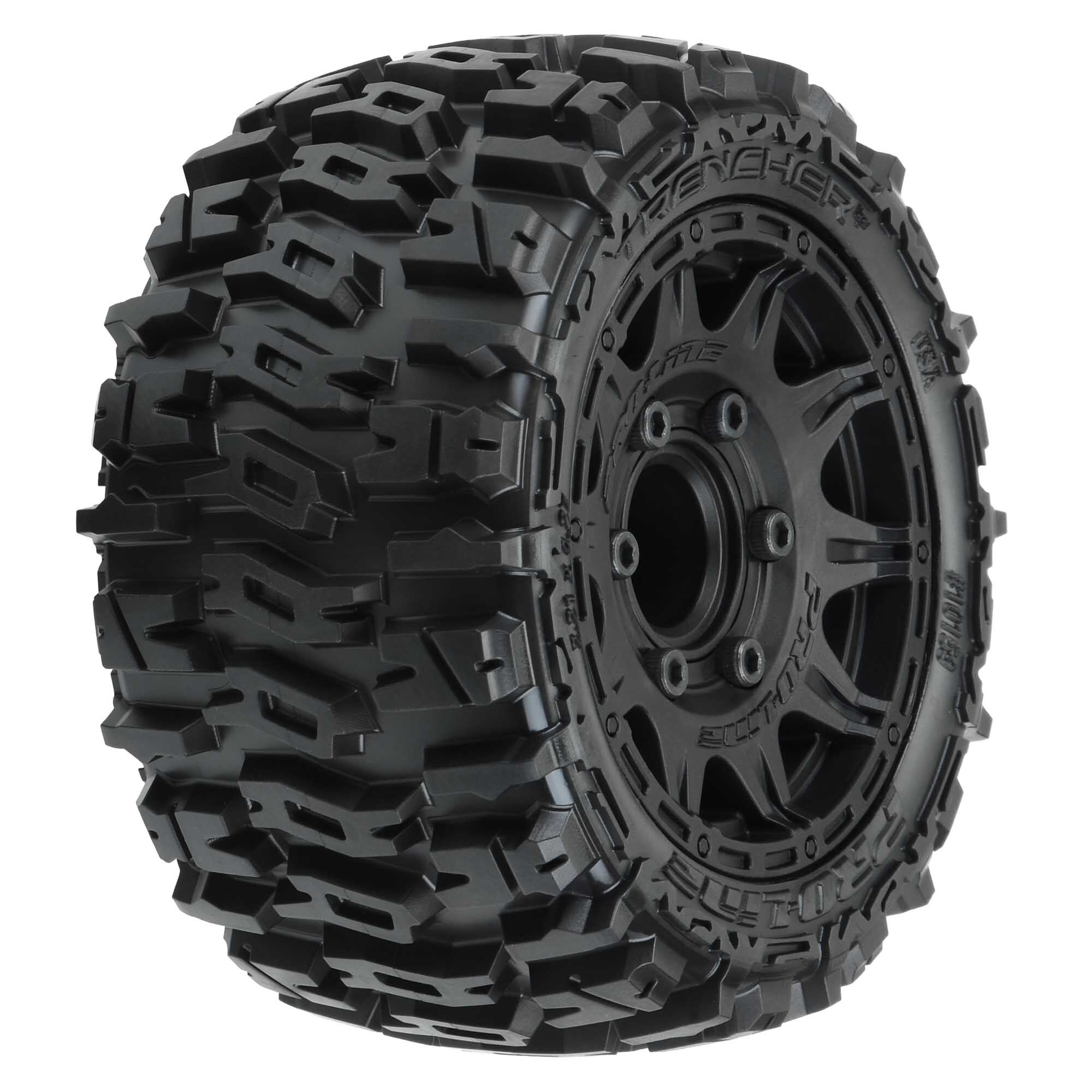 PRO1015910 | Trencher LP 2.8" All Terrain Tires Mounted on Raid Black 6x30 Removable (12mm & 14mm) Hex Wheels (2) for Vorteks™, Rustler® 2WD & 4WD Front and Rear