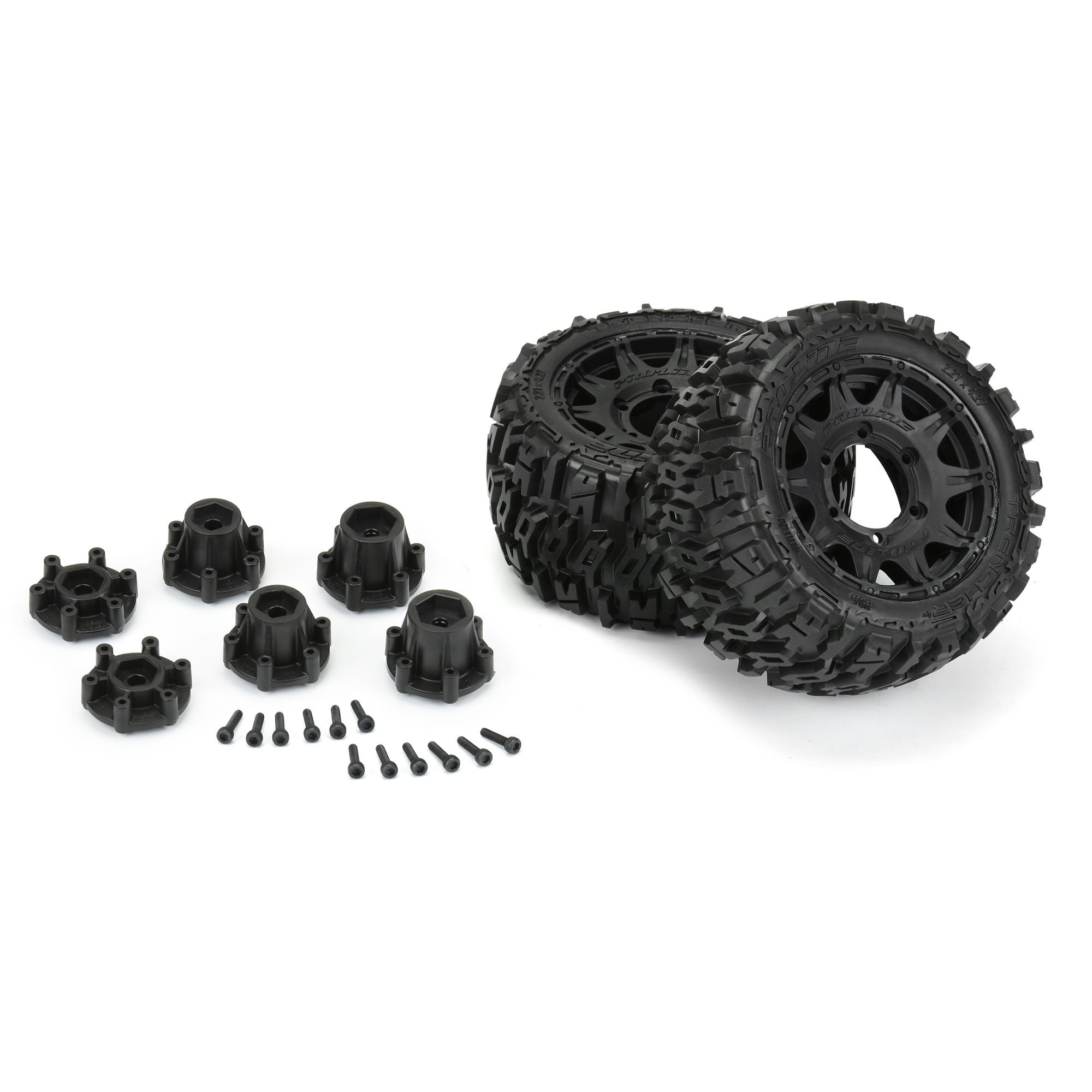 The Trencher LP 2.8" now comes conveniently Pre-Mounted on the next generation 2.8" wheel design from Pro-Line, the Raid 2.8" Removable Hex Wheel! Imagine being able to easily change the offset of your wheel to fit different applications by simply changing out the hex! You can go quickly and easily from the included 12mm narrow offset (2wd Rustler® Rear) to the included 12mm wide offset hexes (2wd Rustler® Front and 4x4 Rustler® Front and Rear) or 14mm wheel hexes (Vorteks™ 3S). Also, imagine being able to replace a damaged wheel hex without needing to replace your glued tires (PRO633500 Replacement Hexes). You can even upgrade your wheels to go for Aluminum hex adapters for extreme bashing fun! These Raid 2.8" wheels accomplish all of this and more by using Pro-Line's unique 6x30 interlocking hex design that is secured to the wheel by 6 M3 screws that are spaced 30mm across. The built-in adjustability and ease of use make this a must-have wheel for bashers everywhere!