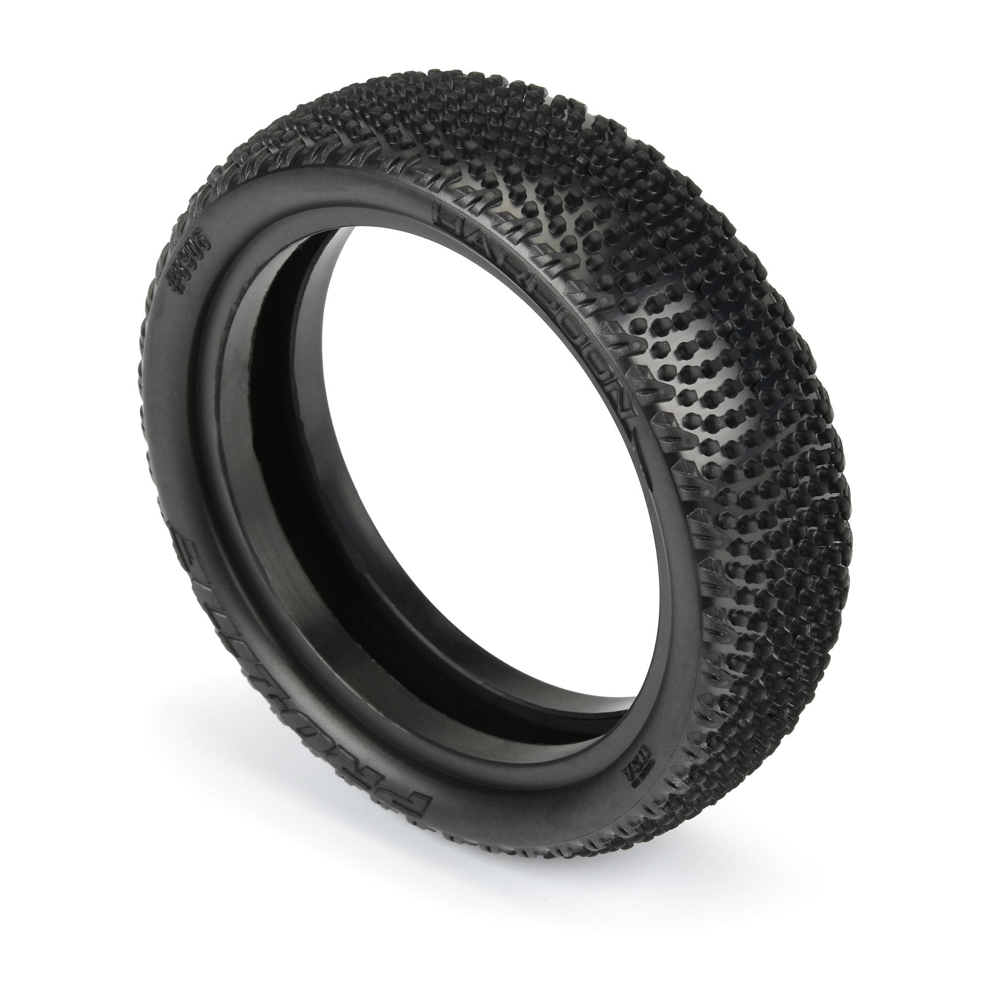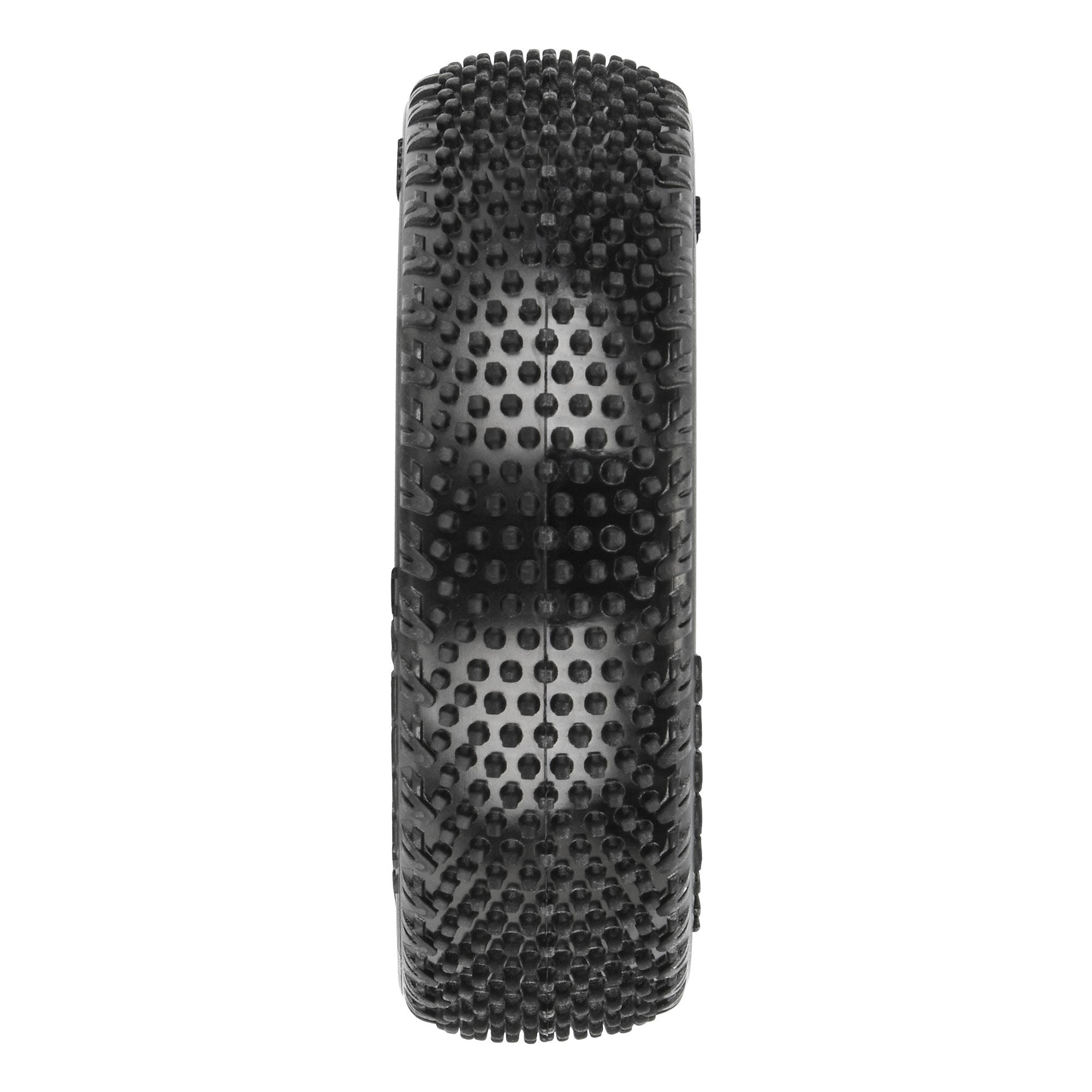 Introducing the Harpoon, Pro-Line's latest and greatest solution for high-grip 1/10 Carpet Buggy Racing. The Harpoon features a unique, modern pin design with a round base for more support and longer wear. The directional pin layout gives the racer options to tune forward and site bite characteristics depending on track conditions. A narrow, lower profile carcass improves agility and reduces sidewall fold-over. The outside harpoon-shaped lugs increase high-speed cornering stability in high grip conditions, reducing the need for sidewall CA gluing.