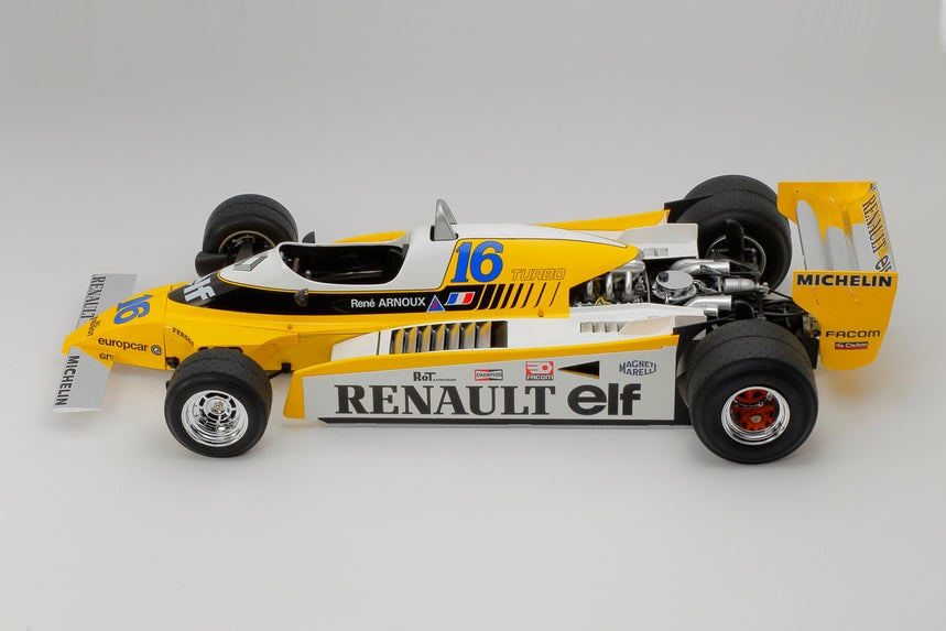 In 1977, Renault's RS-01 (first turbo engine Formula One car) started challenging in races, and in 1979, the RS-10 achieved its first triumph. The RE-20 Turbo was modified version of the RS-10, and this car had a 30kg weight reduction and employed 1.5-liter V6 DOHC twin turbocharged engine capable of around 520hp. Get this re-issued model which depicts the pioneer car of the Formula One turbo engine era.