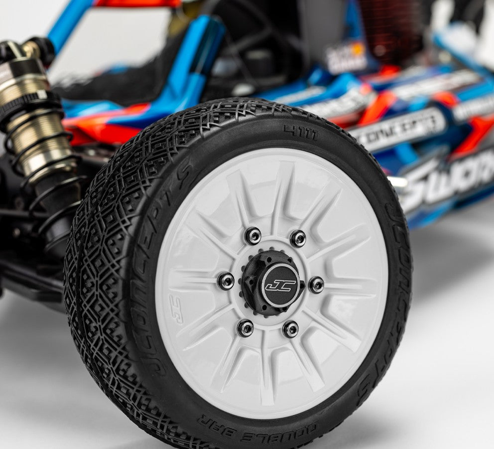 The latest 17mm Punisher "clutch" wheel nuts are all-aluminum and machined for all current 1:8th vehicles and feature the style and dependability necessary for the torture of racing at the highest level. Like the name suggests, the directional nature of the geometry is rather poetic, and reminds racers of another option part in the process. The package arrives with 4 pieces per package and is available in blue and black anodized colors. The inside portion has a directional knurled finish to add locking ability against racing wheels such as the JConcepts Mono #3357 and #3369.