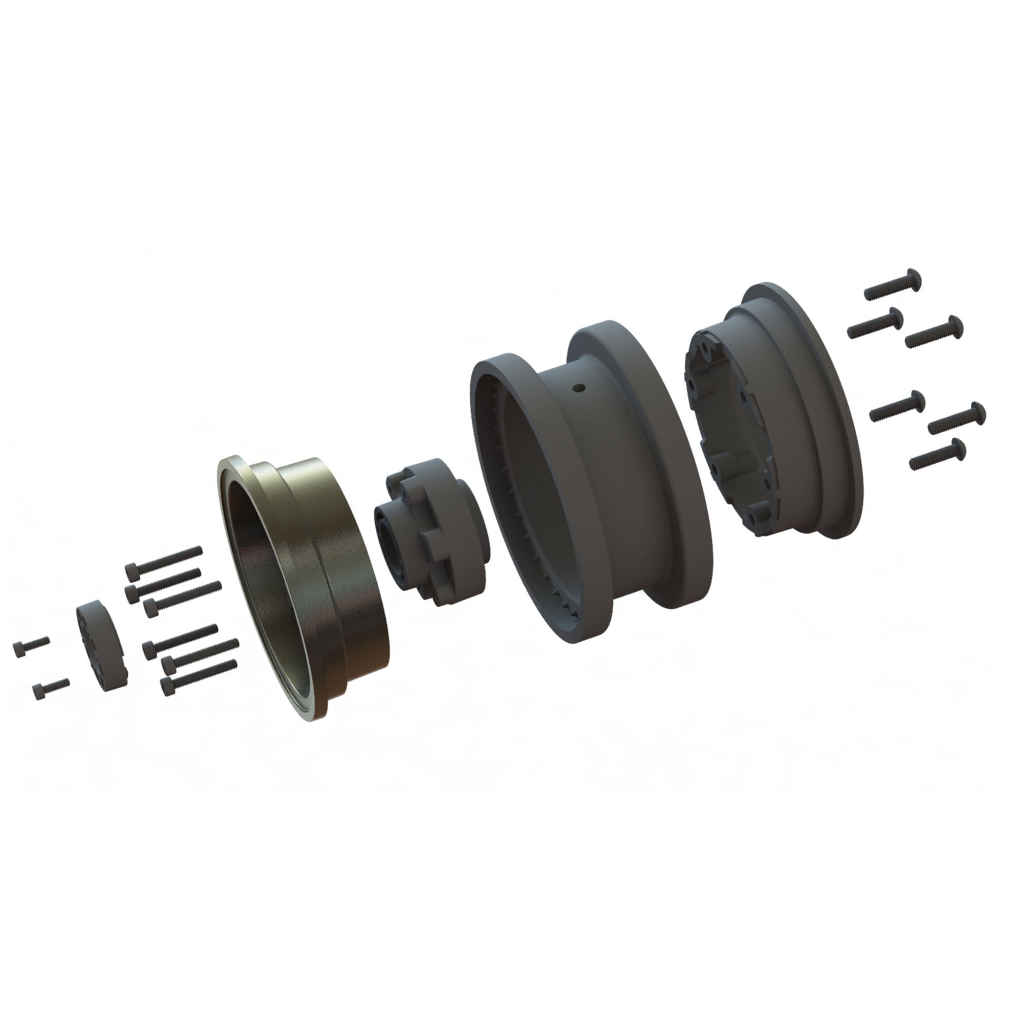 2. Assemble the Aluminum Front Face and the Back Face using (6) M4x16 BHCS, capturing the tire bead.