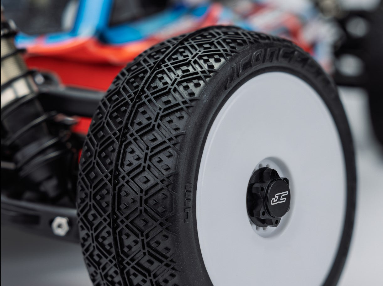 During the march to the 1/8 IFMAR World Championship, JConcepts added another weapon to the bar tire arsenal with the Double Bar. Using previously unseen elements with the dual nature of the tread, the JConcepts item is an entirely different monster. The overlapping and repeated concept is one that intends to tackle conditioned track surfaces and heavy slick groove conditions like never before. Located in the infield of the tread, diamond patterned pins consume space, surface area, and ultimately a flexible arrangement that conforms to high-end racing conditions.