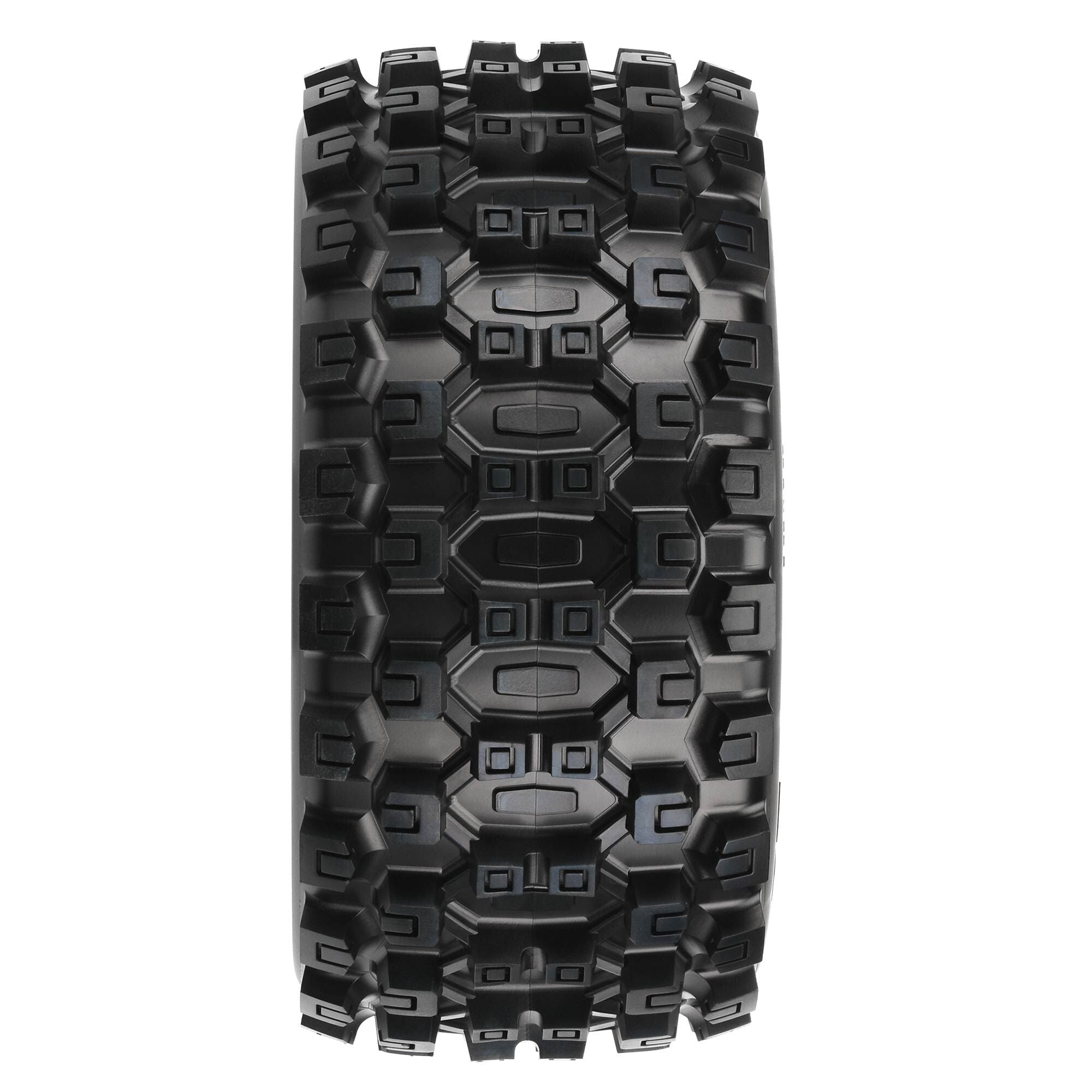 This is a pair of pre-mounted Badlands MX43 tires for X-MAXX®. Pro-Line is ready to unleash the long-awaited tire solution for X-MAXX® owners with the Biggest and Baddest tire and wheel combo ever conceived: the Badlands MX43 mounted on Impulse Wheels! Pro-Line Badlands tires are known for having a sweet Motocross inspired tread and the all-new Badlands MX43 tires kick that up a notch with a Bigger and Bolder knobby tread that matches modern MX tire design. These tires have been developed from the ground up for extreme X-MAXX® punishment with an all-new ultra-durable compound that prevents tire ballooning even at high speeds. The Badlands MX43 features Pro-Line's ground breaking proprietary Pro-Loc Technology that creates an ultra-secure bond to Pro-Line's Impulse Pro-Loc X-MAXX® wheels while still being removable when required. The Badlands MX43 is a true All-Terrain tire that will find traction on any surface but is best suited for loose & loamy dirt, mud or grass. Just imagine your X-MAXX® throwing up huge rooster tails with these aggressive looking tires!