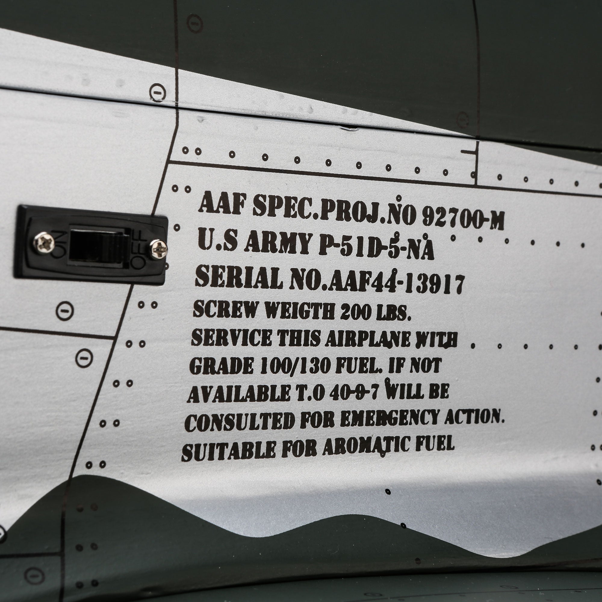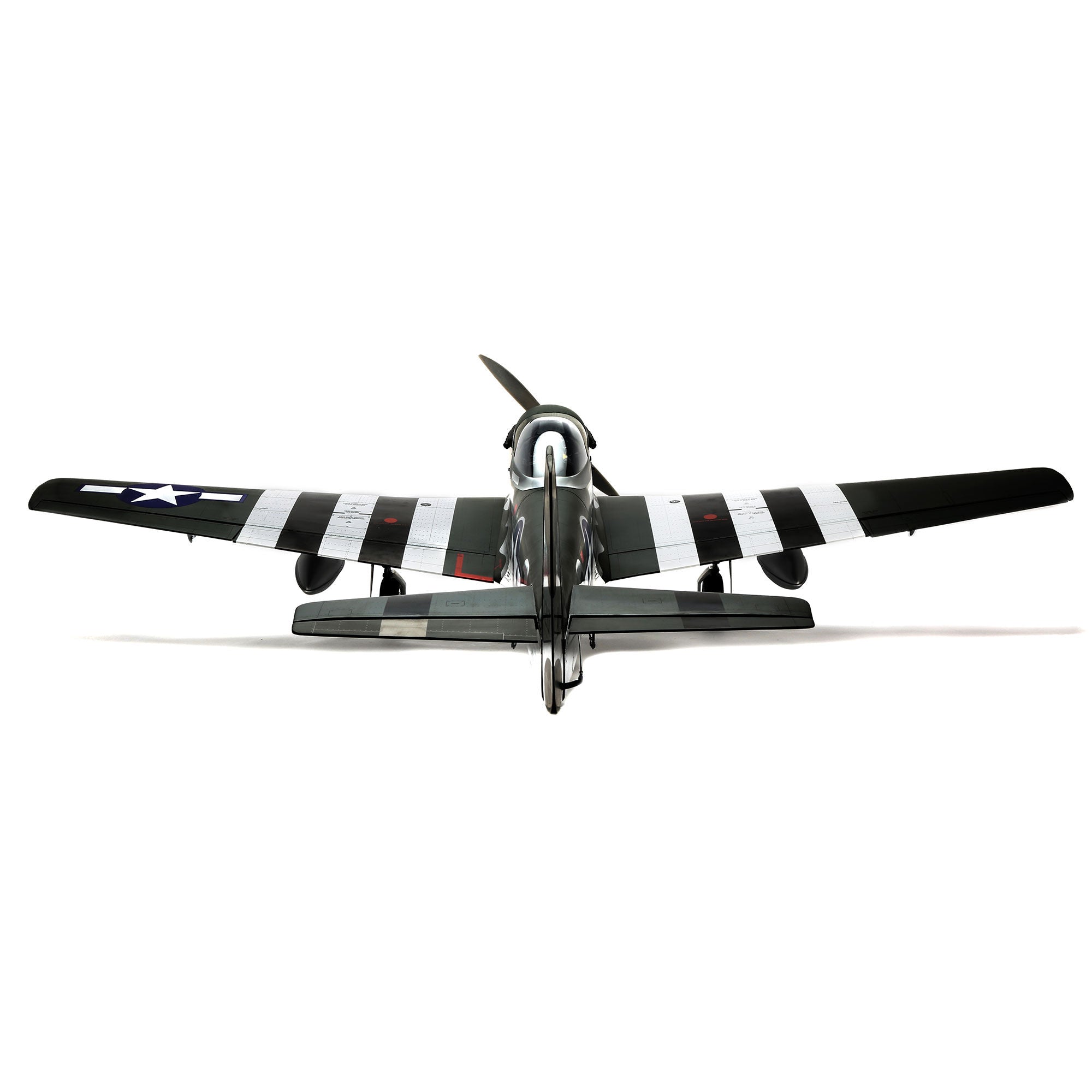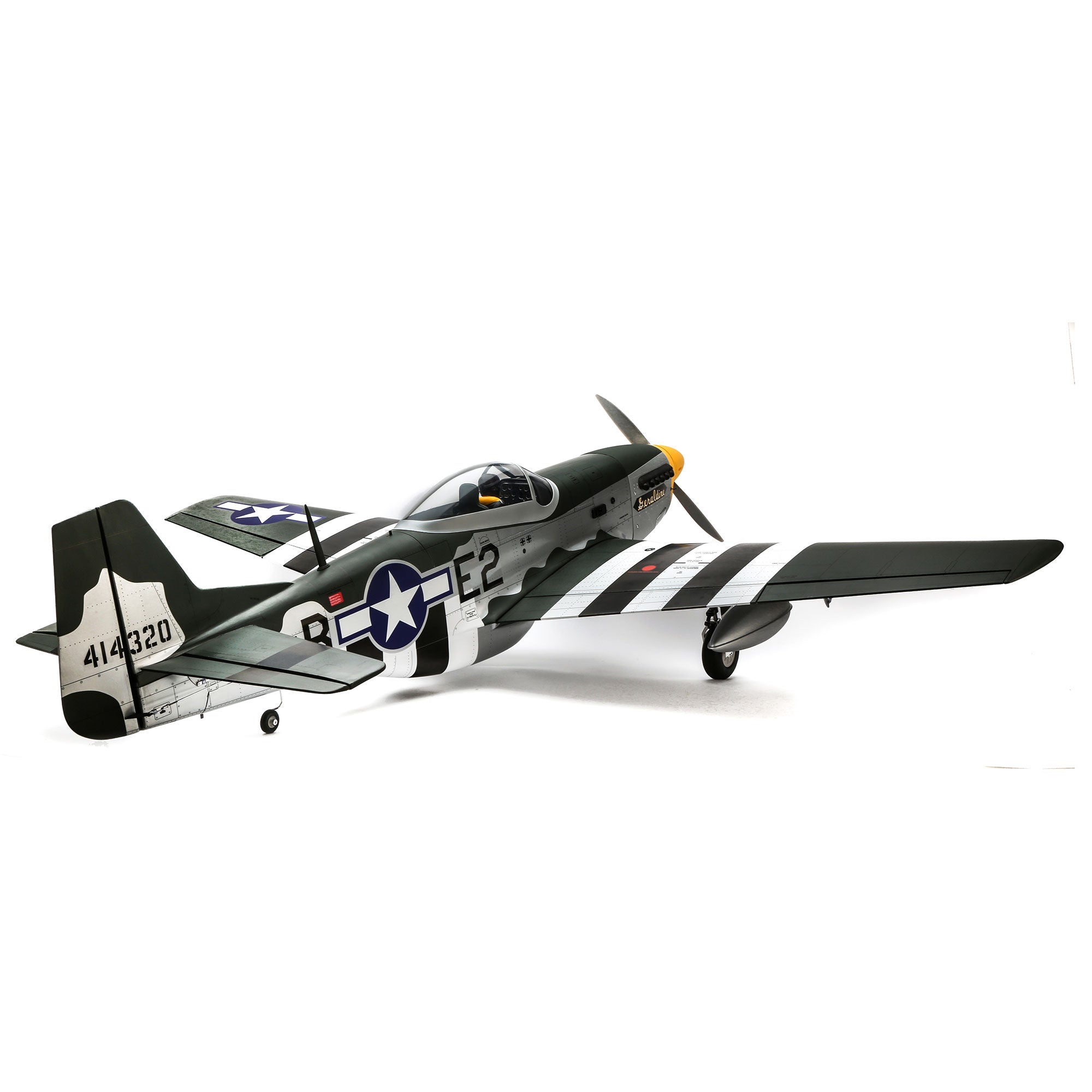 Beyond the factory applied satin-finish printed covering, other iconic details include airfoil-shaped tail surfaces, realistic engine exhaust, wing guns, gear doors, optional-use drop tanks, radio antenna, a 3D instrument panel and a painted pilot figure.