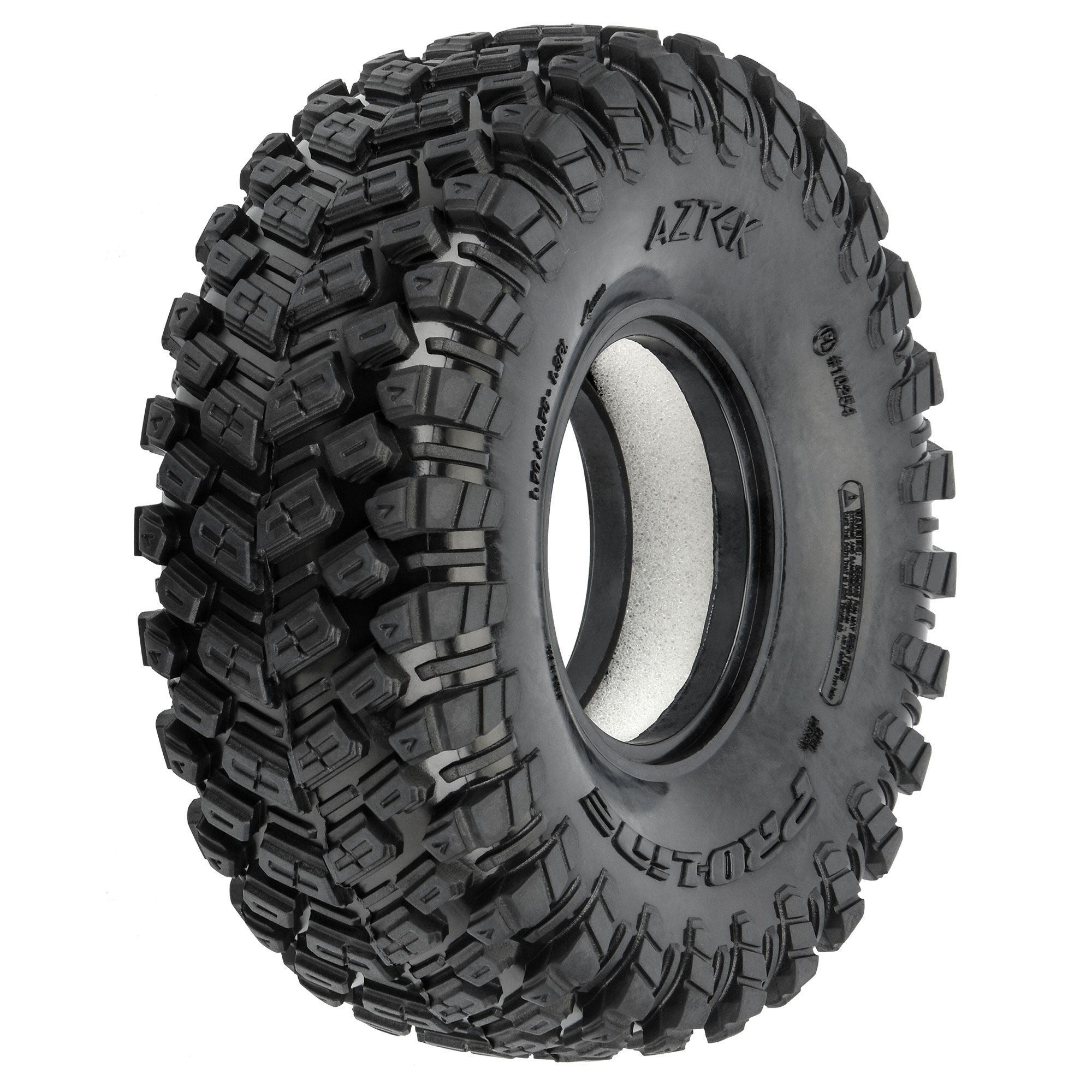This is a pair of Aztek 1.9" Rock Crawling Tires. Pro-Line proudly announces the release of the Aztek, a revolutionary RC rock-crawling tire designed to redefine off-road performance standards. The Aztek boasts a chevron-shaped, stepped lug tread design, fortified by heavy-duty sidewall lugs with siping for enhanced side-hilling capabilities. This tire is meticulously crafted to conquer any terrain, offering exceptional forward bite in wet or dry, abrasive or slick conditions.