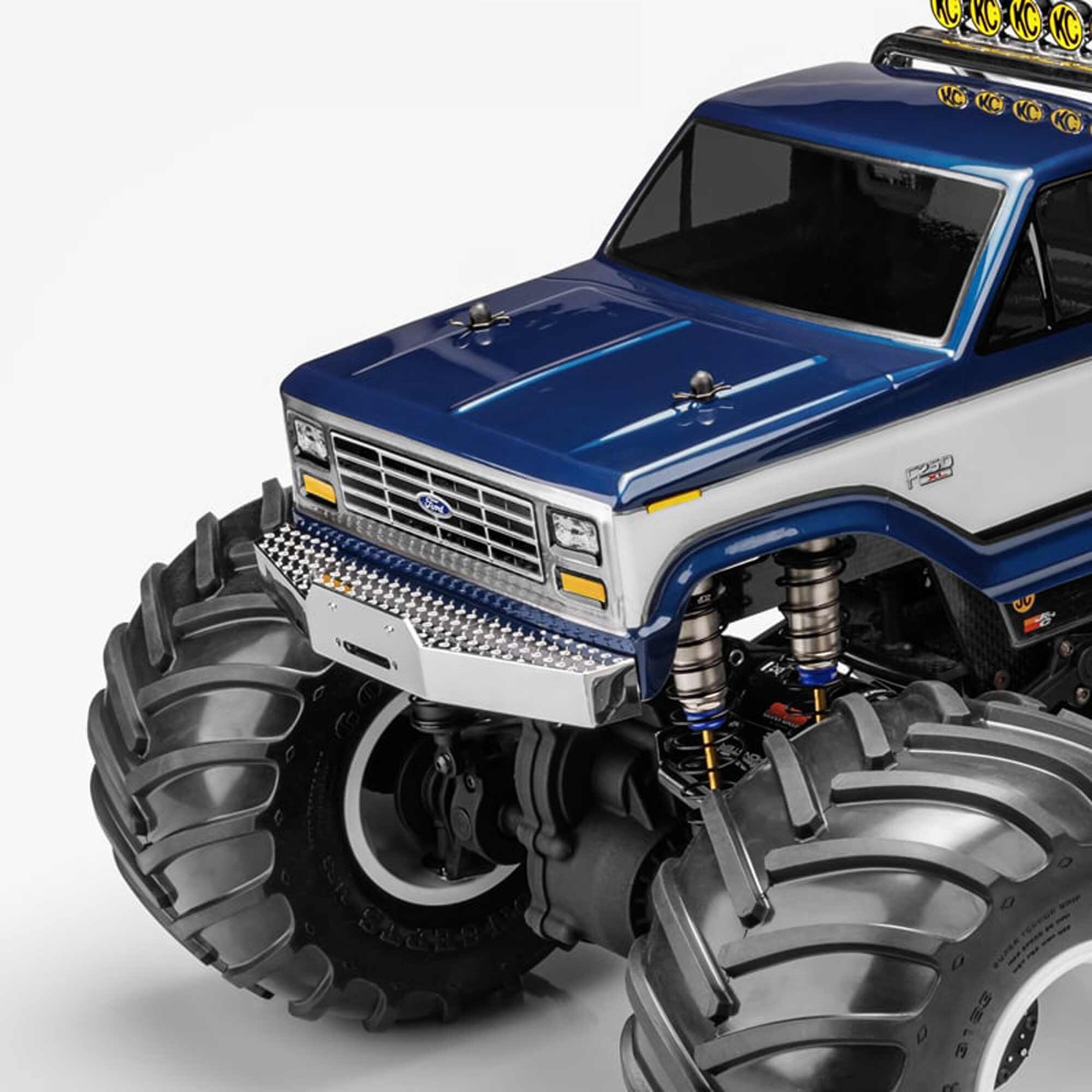The F-style front bumper set incorporates a plate steel look with chrome finish on an injection molded part. The plastic bumper is designed to work with bodies such as the JConcepts, 1979 Ford F-250 (#0305 / #0329), 1985 Ford F-250 (#0417), and 1982 GMC (#0381). These body shells have a flat or bumper-less front-end and it allows an easy way to bolt-on the new piece to take detailing to another level. One of the elements of the design, a trimline is added on top of the bumper within the diamond plate surface which can be removed to outfit the chrome plated piece with a mock front winch setup. In addition, JConcepts added a front winch guard that installs with included hardware for a complete look.