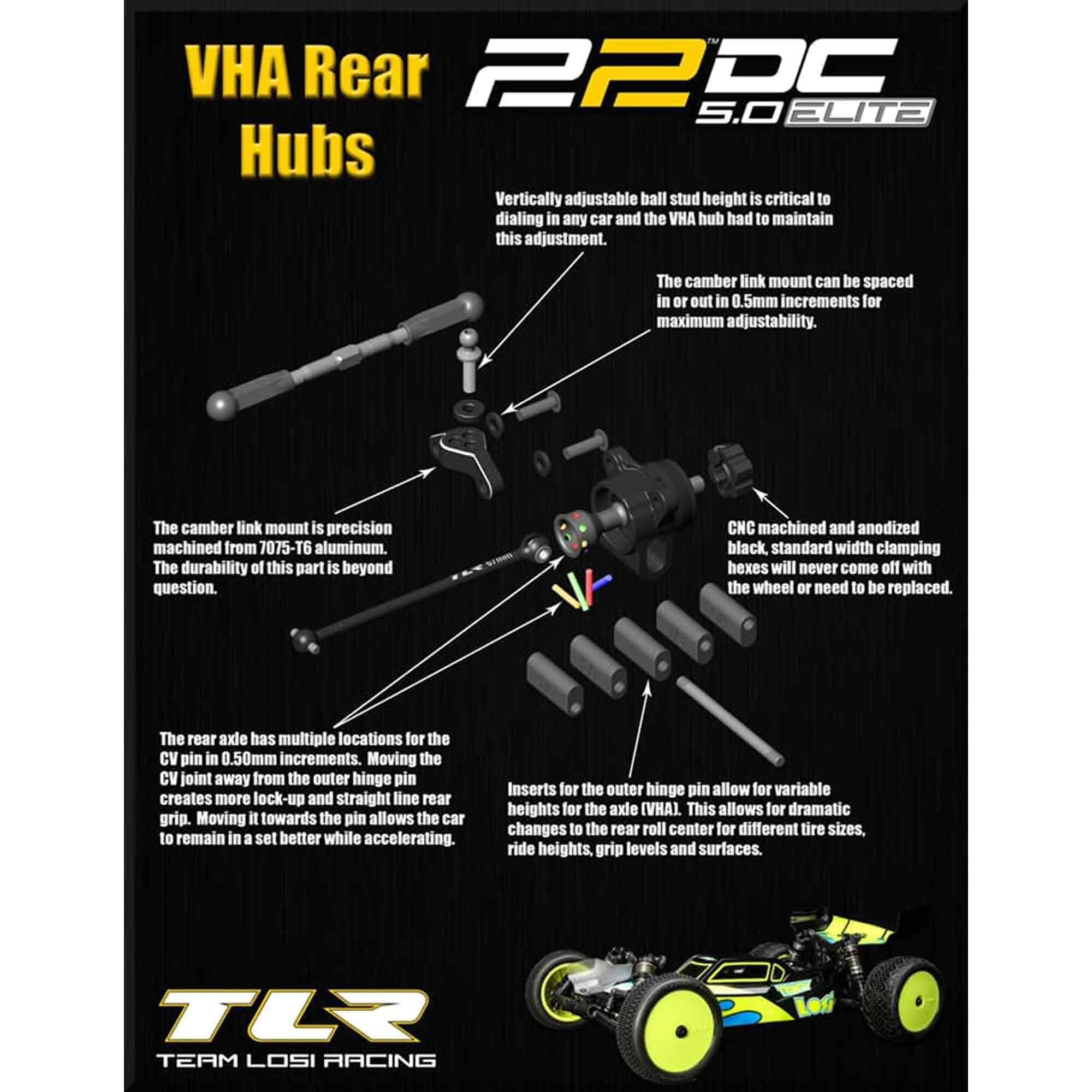 Convert your 22S Sprint rear suspension to a variable height axle (VHA) setup. By being able to adjust the rear axle height, you can tune roll center. Kit includes new composite rear arms, composite hubs with three composite inserts per side, stub axles, ball bearings, and machined 7075-T6 aluminum upper camber links mounts for a vertical ball stud for easy adjustment. The rear axle has multiple CV pin locations in 0.50mm increments. This moves the CV joint in relation to the hinge pin. Moving the CV joint away from the hub hinge pin provides more lock-up and straight line rear grip. Moving it toward the hub hinge pin allows the car to remain planted better while accelerating.