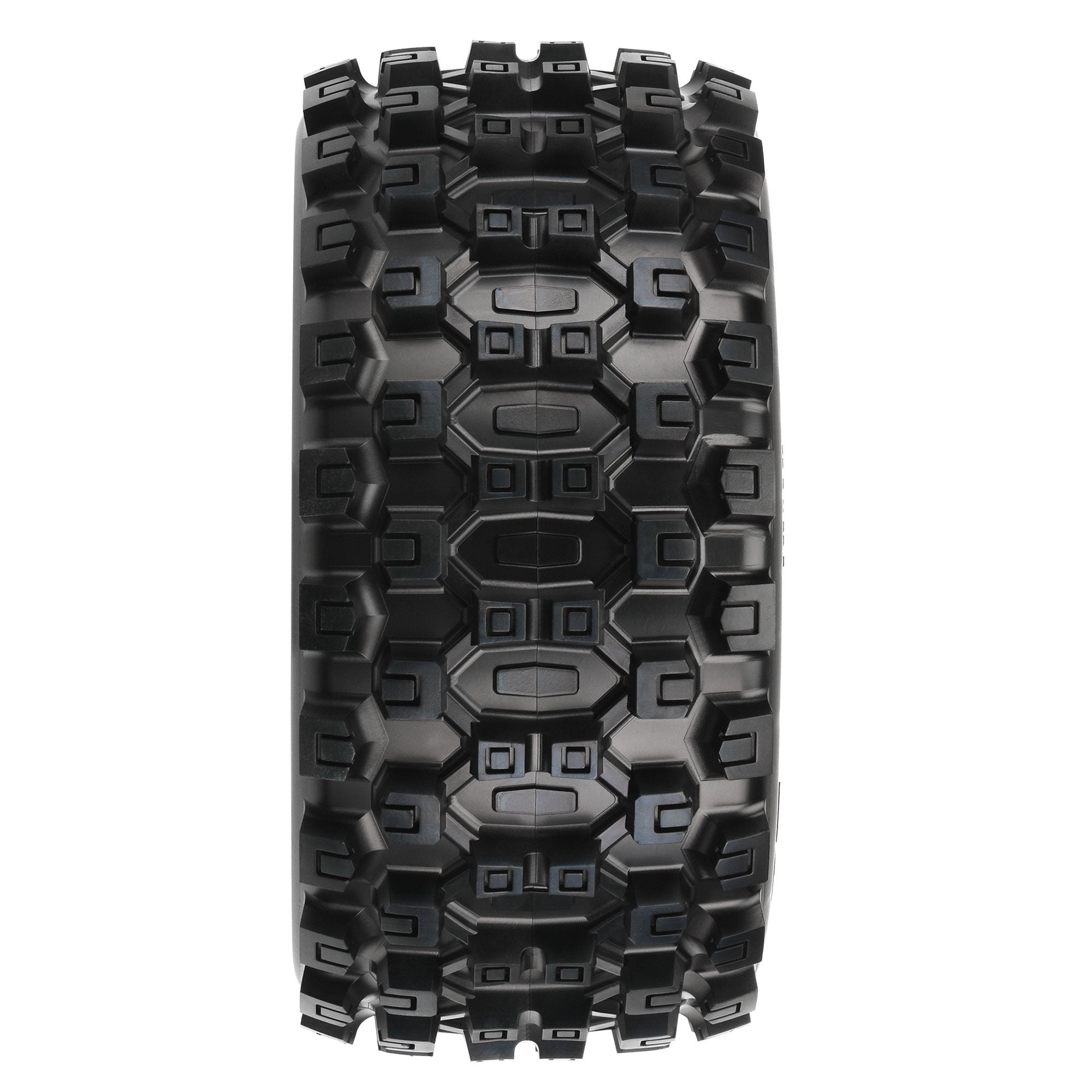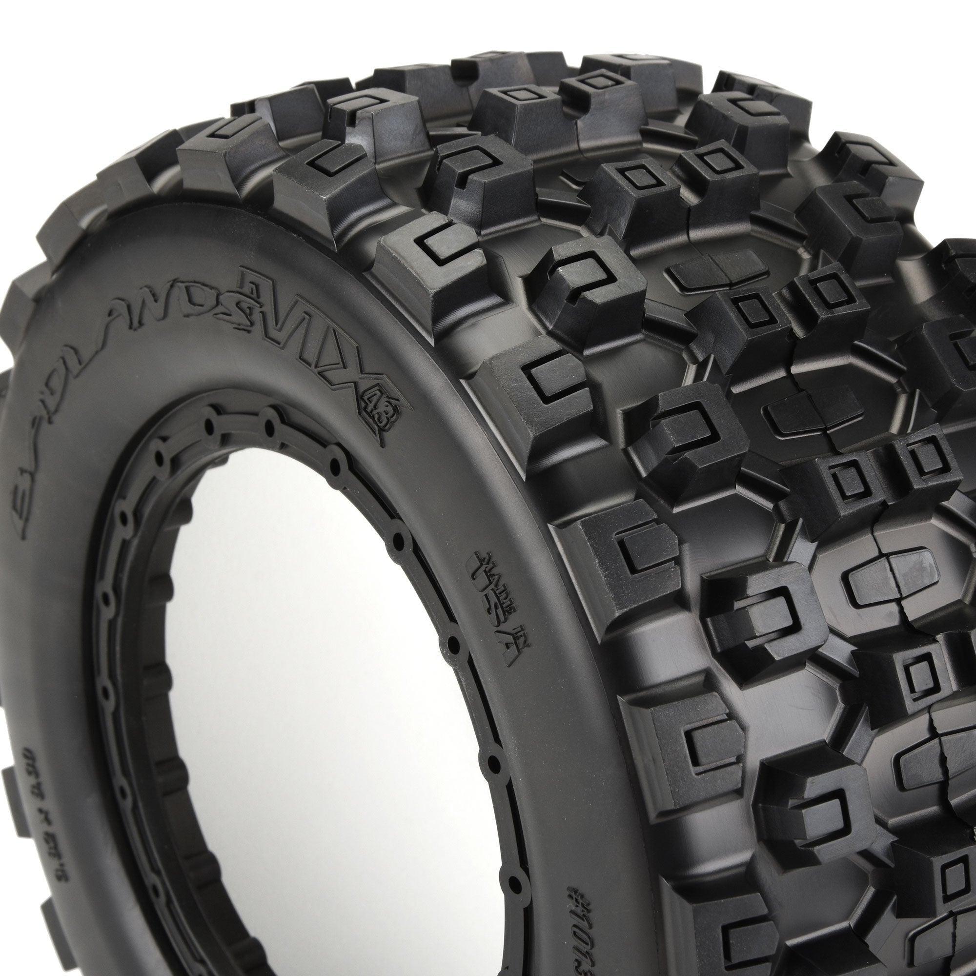 This is a pair of Badlands MX43 Pro-Loc tires. Pro-Line is ready to unleash the long-awaited tire solution for X-MAXX® owners with the Biggest and Baddest tire ever conceived: the Badlands MX43! Pro-Line Badlands tires are known for having a sweet Motocross inspired tread and the all-new Badlands MX43 tires kick that up a notch with a Bigger and Bolder knobby tread that matches modern MX tire design. These tires have been developed from the ground up for extreme X-MAXX® punishment with an all-new ultra-durable compound that prevents tire ballooning even at high speeds. The Badlands MX43 features Pro-Line's groundbreaking proprietary Pro-Loc Technology that creates an ultra-secure bond to Pro-Line's Impulse Pro-Loc X-MAXX® wheels (PRO276303) while still being removable when required. The reinforced Tire bead fits into a uniquely shaped channel on the wheel and the bead-loc screws actually pass through the tire rubber before being pinched by the outer bead-loc ring to create the maximum possible mounting security. The Badlands MX43 is a true All-Terrain tire that will find traction on any surface but is best suited for loose & loamy dirt, mud or grass. Just imagine your X-MAXX® throwing up huge rooster tails with these aggressive looking tires!