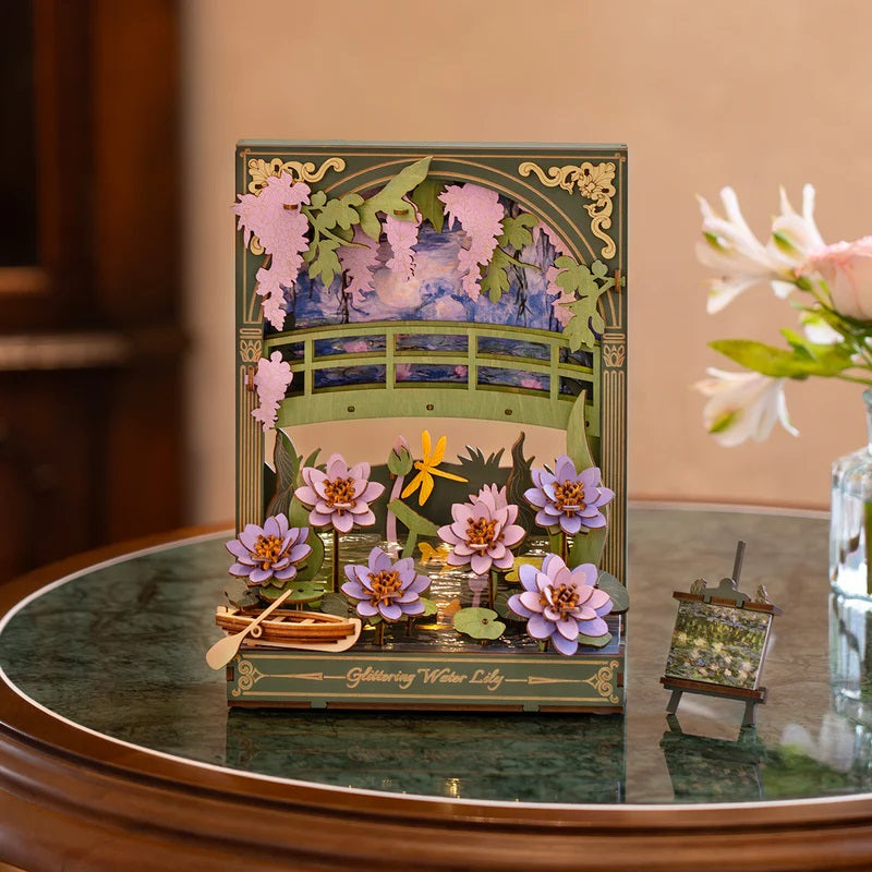 Rowood plays with Claude Monet's fascination with light and changing reflections with the Glittering Water Lily, a relaxing 3D wooden puzzle and artful tabletop ornament that elevates any space. Several intricately layered lilies bloom across the pond, along with a charming wooden rowboat resting beneath an arched garden bridge. Soft LED ambient lighting adds a magical glow to the entire scene, reminiscent of the famous painter's play with golden hour lighting. You can use this as a night light, a bookshelf decor, or a thoughtful gift for those who appreciate the serenity this 237-piece puzzle can bring. It's deeply atmospheric and dreamlike, a personal oasis that you can build with your own two hands.