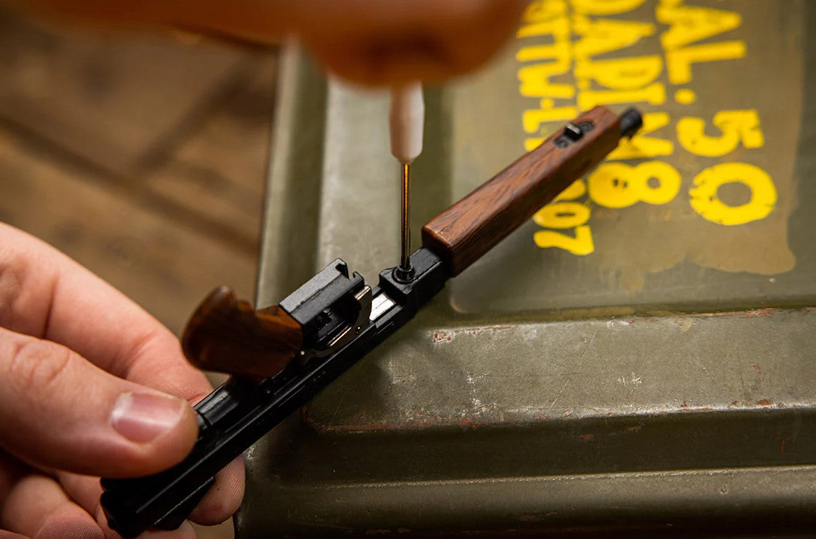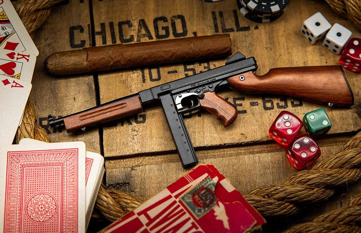 This Submachine Gun is a historic firearm developed in the United States during the 1920s. It's chambered for the .45 ACP cartridge and is known for its distinctive appearance with a drum or box magazine. Widely used by American troops during World War II.