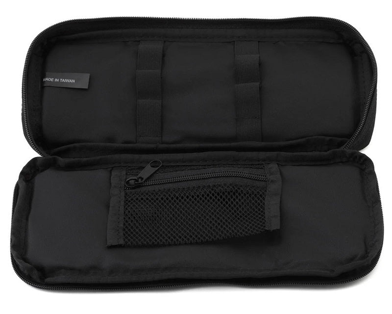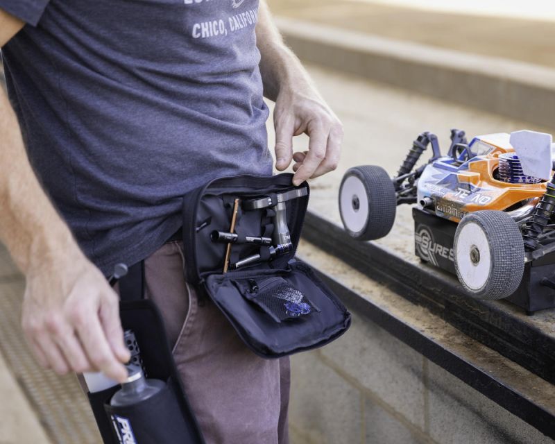 Constructed from heavy-duty fabric, this pack is built to withstand the rigors of the racing environment. Its compact design makes it easy to carry, while a zippered compartment and elastic straps securely hold your tools, ensuring nothing is left behind. The zippered pouch is perfect for storing small parts like glow plugs, and the additional elastic straps behind the zippered pouch are ideal for items like tuning screwdrivers or glow igniters. With belt clips included, this is a must have for any racer!